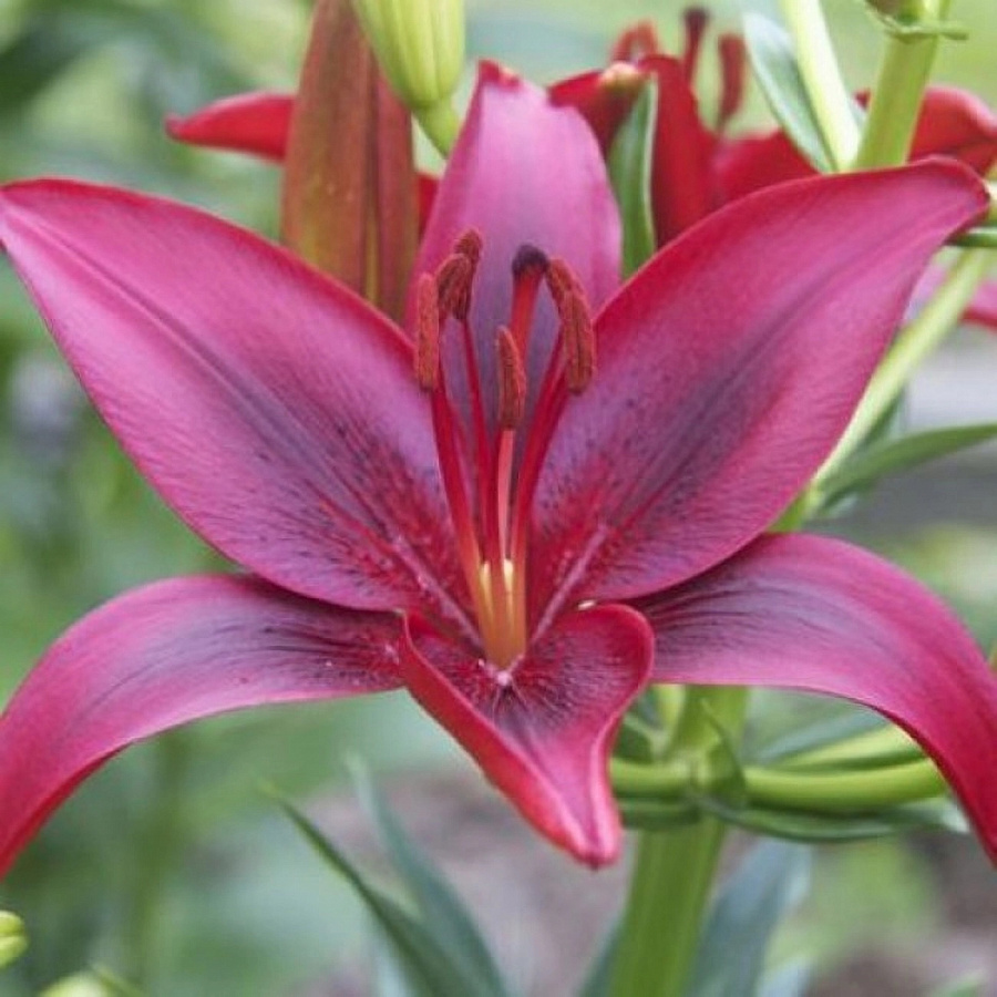 Луковицы лилии азиатской Блэк Лист порадуют не только величественными размерами своих цветоносов, но и невероятно яркими, привлекающими внимание крупными цветами. Лепестки лилии имеют множество переливов разных оттенков. Основной темный малиново-розовый цвет дополнен фиолетовым и пурпурным отливом. Таким же темным цветом оформлены края лепестков. Красочным и ярким элементом выступают контрастирующие с основными оттенками оранжевые пыльники. Цветы прекрасно смотрятся на цветоносе, который обильно покрыт темно-зелеными, слегка сизоватыми листьями. Цветы долго сохраняют свежесть в срезанном виде.
