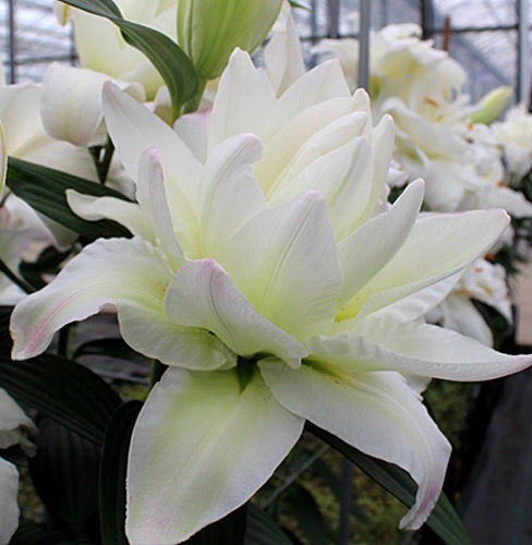 Лилия азиатская махровая сноуборд - это великолепное растение, которое поразит вас своей красотой и изысканностью. Ее стебель достигает высоты до 85 см, а цветки белоснежного цвета с нежными розовыми крапами и мазками по краям лепестков радуют глаз размером до 20 см. Листья лилии имеют уникальную форму, что делает это растение еще более привлекательным.