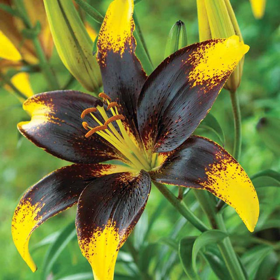 Луковицы Лилии азиатской Танго Лайон Харт (Lilium asiatic Lion Heart) получили название (в переводе «Сердце льва») за одну из самых неожиданных раскрасок. Распустившийся цветок классической звездчатой формы сочетает в себе ярко-желтые края и лилово-черную середину. Цветение начинается в конце июня-начале июля и продолжается в течение четырех недель. Распустившиеся бутоны в диаметре могут достигать 16 см. В среднем рост растения составляет 90 см. Лайон Харт, как и тот, в честь которого назван сорт, имеет отличное здоровье, непритязателен к уходу и химическому составу почвы, отличается морозостойкостью.
