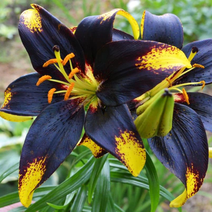 Окраска цветка : цветы золотисто-желтые, с многочисленными темными крапинками, сливающимися в широкую темно-лиловую сердцевину, классической звездчатой формы, широко-раскрытые, направлены вверх и в стороны